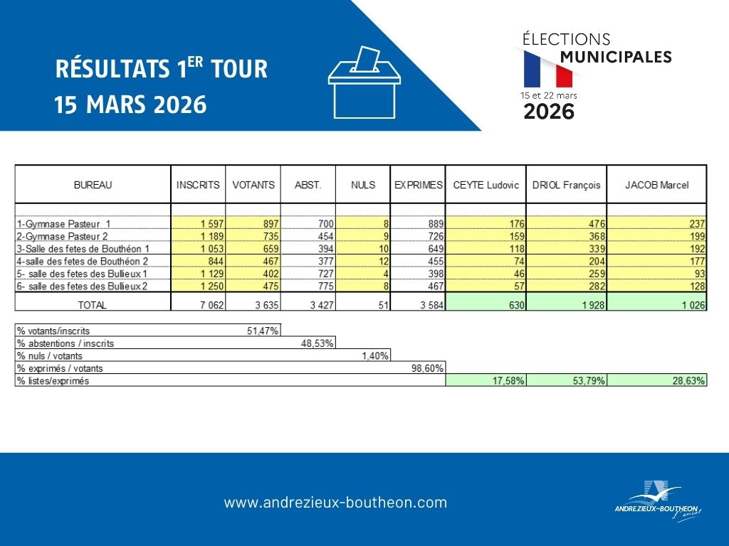Retrouvez ci-dessous les résultats des scrutins municipaux et communautaires de ce dimanche 15 mars 2026, par bureau de vote.